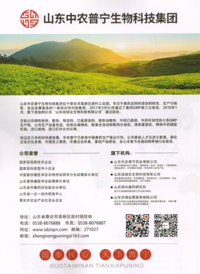 為此,作為致力于動(dòng)物健康與人類食品安全為發(fā)展宗旨的中農(nóng)普寧生物科技集團(tuán),通過(guò)中獸醫(yī)專家的潛心研發(fā)經(jīng)過(guò)多年臨床實(shí)踐,結(jié)合國(guó)內(nèi)蛋禽養(yǎng)殖特點(diǎn),隆重推出了倍新美、安爾康、安若素等中藥產(chǎn)品,為養(yǎng)殖業(yè)保駕護(hù)航。