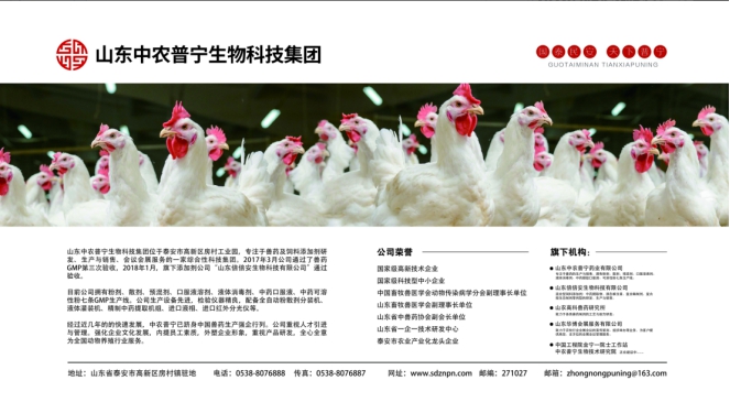 隨著政府對動物源性食品安全問題的極大關(guān)注以及民眾對食品安全重要性認(rèn)識的不斷提高,中獸醫(yī)藥必將在畜禽綠色健康養(yǎng)殖中發(fā)揮出更大的作用,為此,作為以致力于動物健康與食品安全為發(fā)展宗旨的中農(nóng)普寧生物科技集團(tuán),通過中獸醫(yī)專家的潛心研發(fā)經(jīng)過多年臨床實踐,結(jié)合國內(nèi)肉雞養(yǎng)殖特點(diǎn),隆重推出了安爾康、安若素、倍爾爽等中藥產(chǎn)品,為養(yǎng)殖業(yè)保駕護(hù)航。